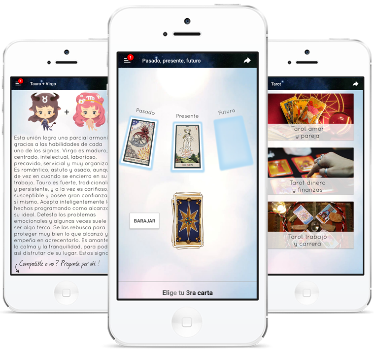 Lee la interpretación de tus cartas de tarot en los temas del amor, trabajo y dinero. Aplicación gratis 100% en español.